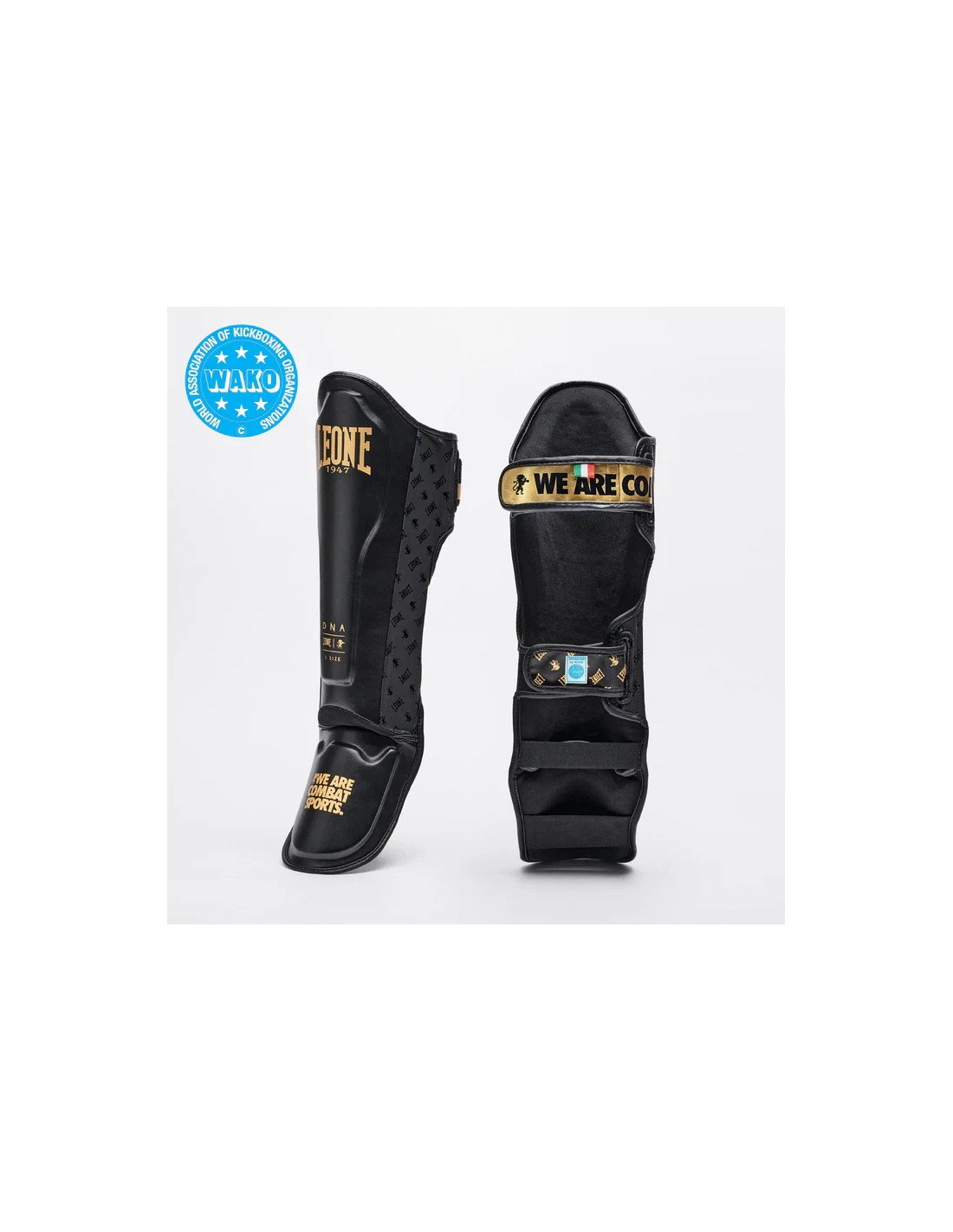 Protège-tibias WAKO de Leone1947 avec étiquette pour les combats de kickboxing